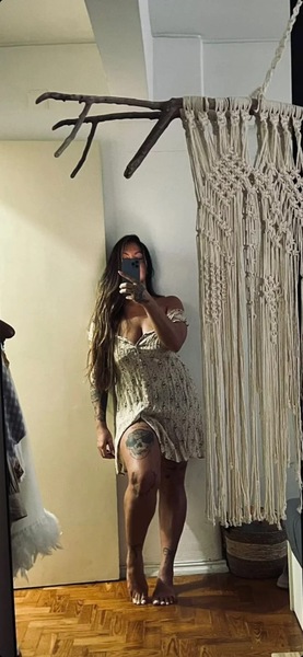Haare:brünett, rückenlang, glatt