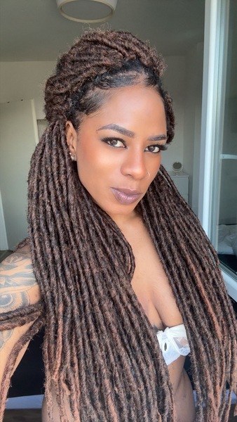 | Haare: | dunkelbraun, rückenlang, Braids (Flechtzöpfchen) |